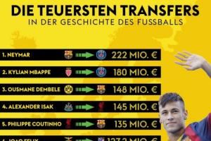 体育资讯09月04日讯 夏窗已经结束,德天空统计了最新的足坛历史最贵转会排行榜,其中,伊萨克位居第四,维尔茨位列第八,内马尔仍居首。