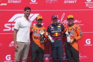 库尔图瓦现场观看F1比利时大奖赛,并与冲刺赛领奖台车手维斯塔潘、皮亚斯特里、诺里斯合影。