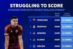 体育资讯10月25日讯 德国转会市场盘点了进攻球员进球荒场次,并列出榜单,埃文-弗格森25场,罗德里戈24场。