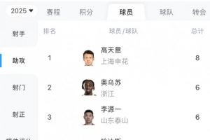 截至第19轮中超助攻榜:高天意8次居首,奥乌苏李源一6次并列第二